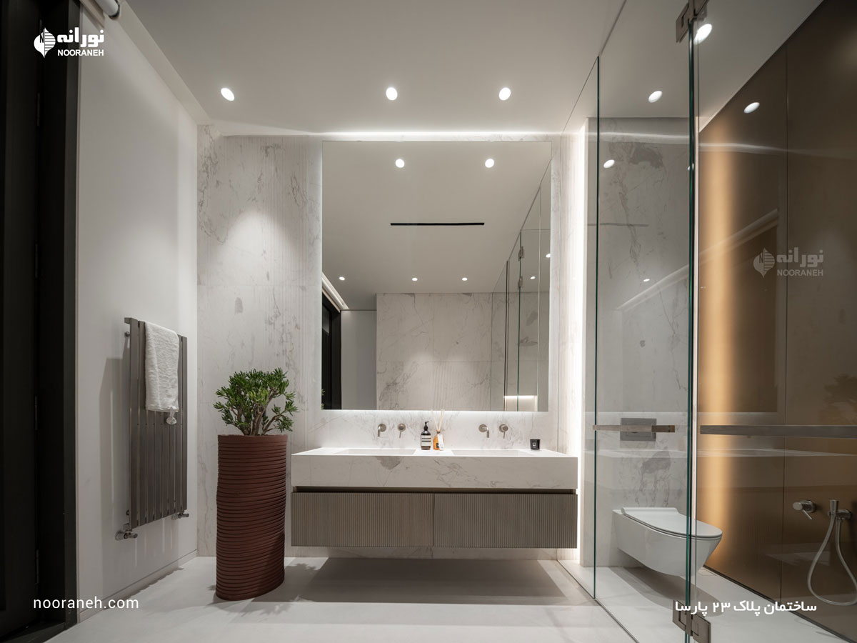 - چراغهای LED: با مصرف انرژی کم، طول عمر بالا و امکان تنظیم شدت و دمای نور، گزینهای عالی برای حمام هستند.