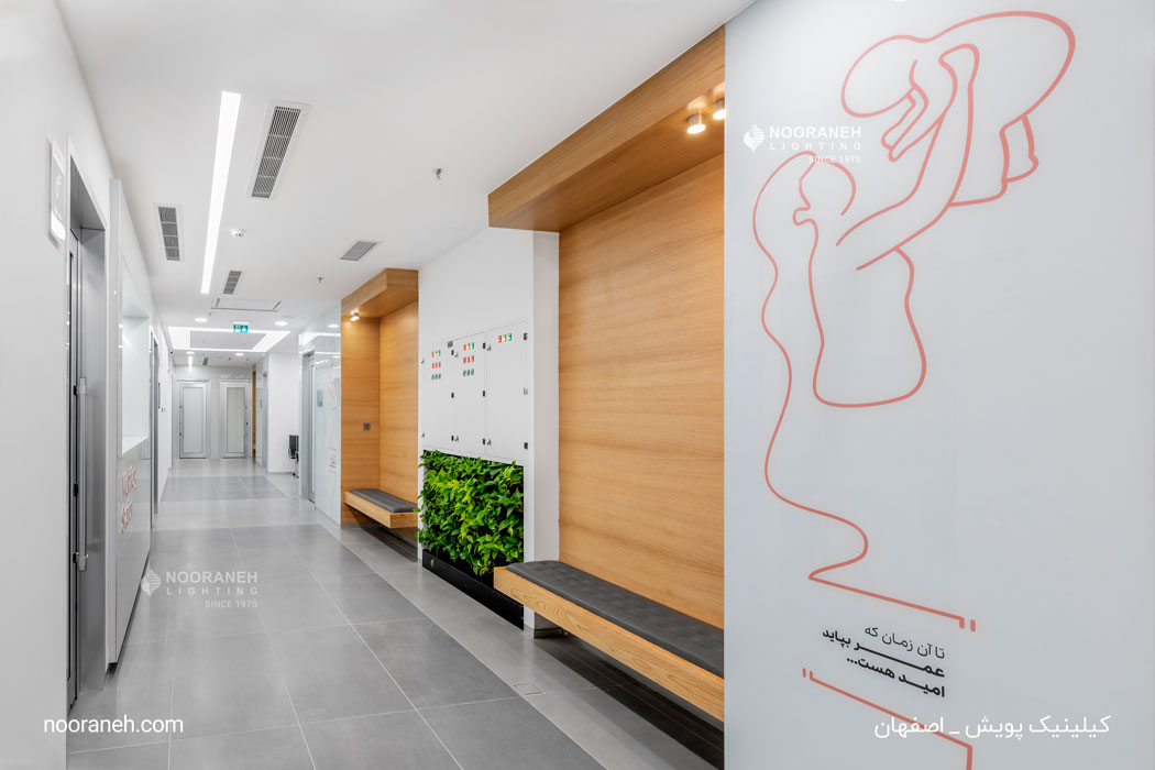 در فضای پذیرش و راهروها، روشنایی باید حس آرامش و دعوت کنندگی را منتقل کند. این فضاها به‌عنوان اولین مکان‌هایی هستند که بیماران و بازدیدکنندگان به آن وارد می‌شوند، بنابراین ایجاد فضایی پذیرا و اطمینان بخش از اهمیت ویژه‌ای برخوردار است.