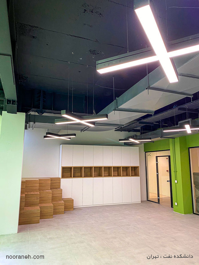 استفاده از اشکال هندسی و خطی از راهکارهای مدرن در طراحی نورپردازی است که در دانشکده نفت تهران با چراغ های خطی آویز نورانه انجام شده است. چراغ خطی آویز به منظور نورپردازی انواع فضا در عرض های 3.5 ، 6 و 9 سانتی متر و در طول های سفارشی و رنگ های متنوع تولید می گردد.