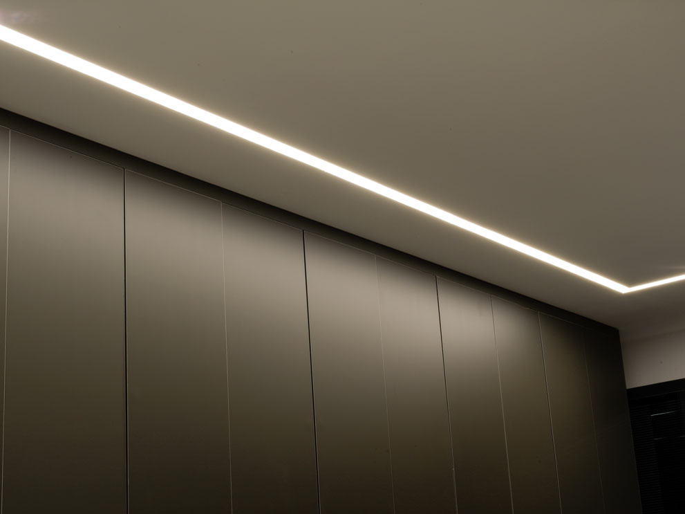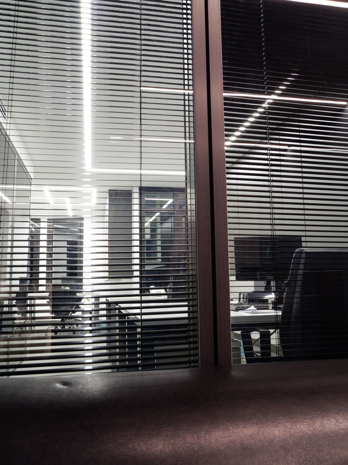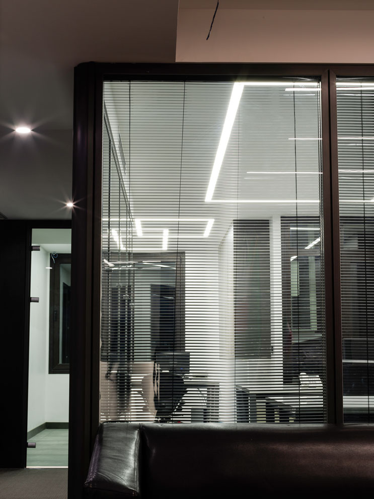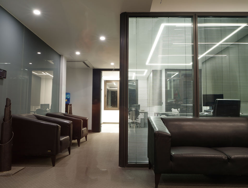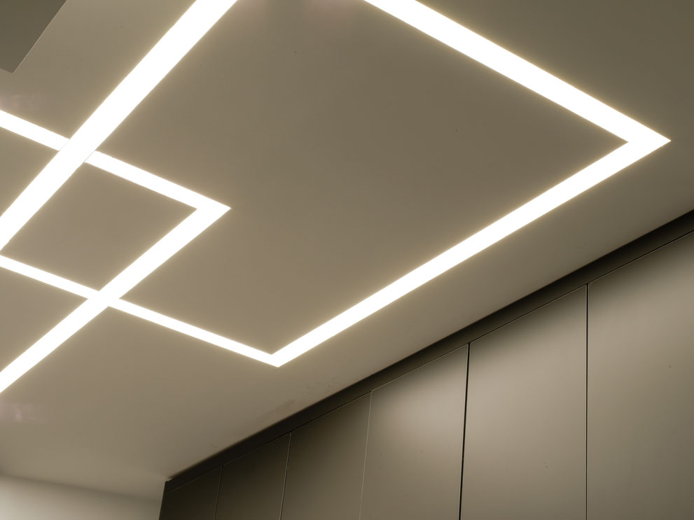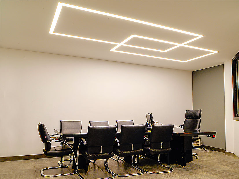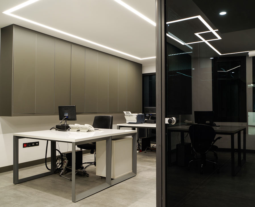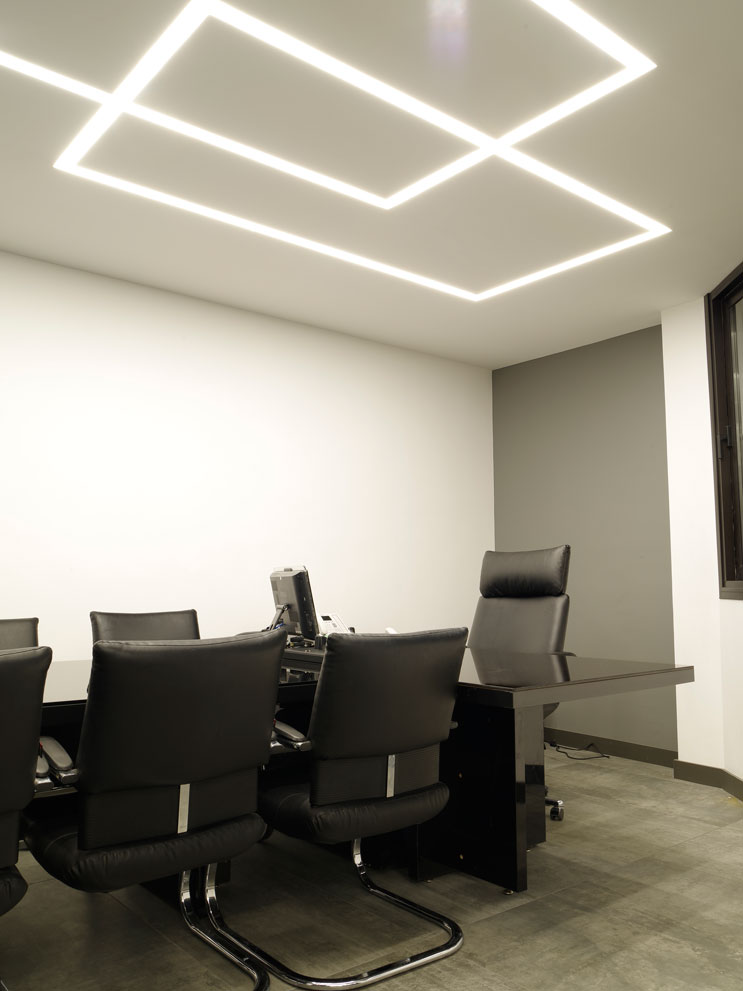 چراغ های خطی نورانه اجرا شده در دفتر اداری واقع تهران علاوه بر نورپردازی فضای اداری، زبیایی خاصی به فضا بخشیده است. چراغ های خطی ستفاده شده در این پروژه شامل لاین های رو کار و آویز با عرض نوری 60 میلی متر هستند که در اشکال هندسی مختلف اجرا شده اند.