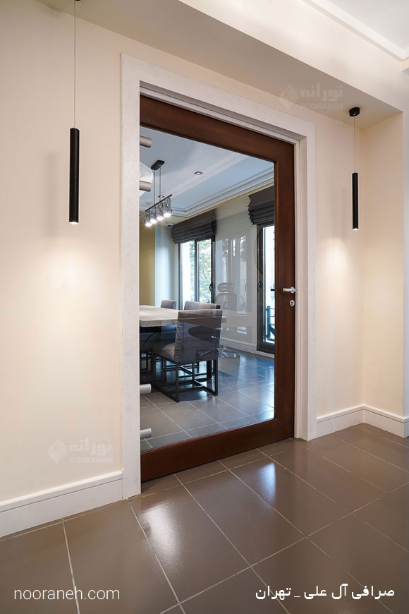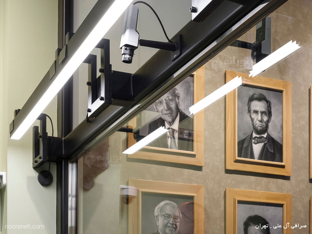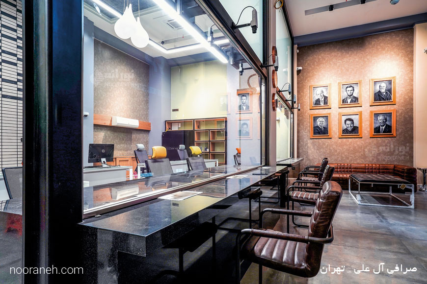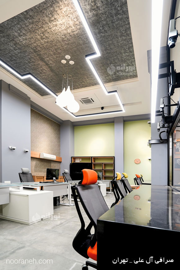 نورپردازی صرافی آل علی واقع در تهران، توسط چراغ های ال ای دی تولید شده توسط صنایع روشنایی نورانه شامل چراغ خطی آویز مدل لاین، جهت تامین نور عمومی و وظیفه، و چراغ آویز دکوراتیو سیلوا جهت نورپردازی دکوراتیو می باشند.