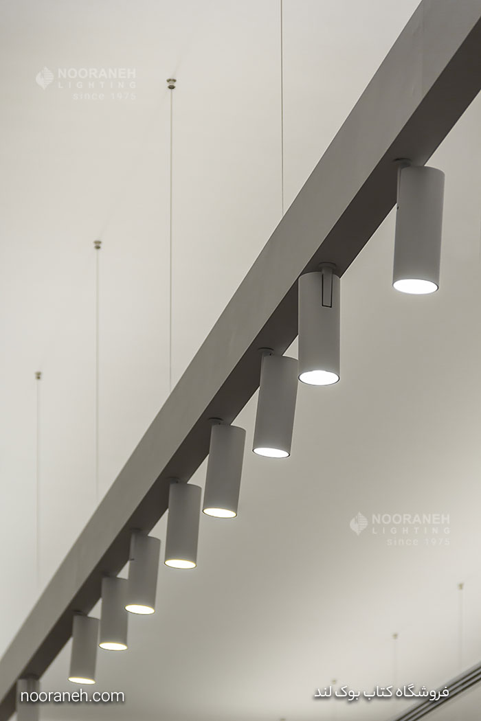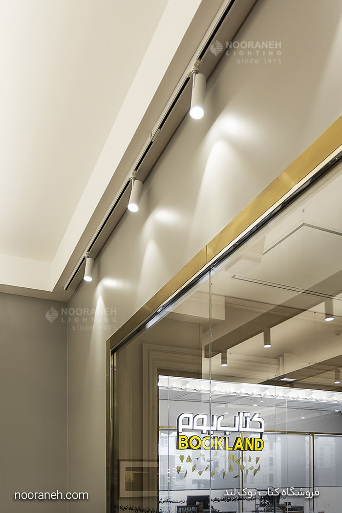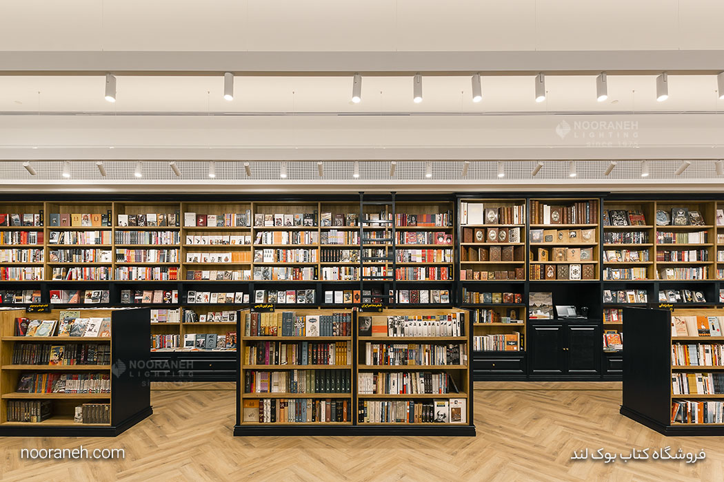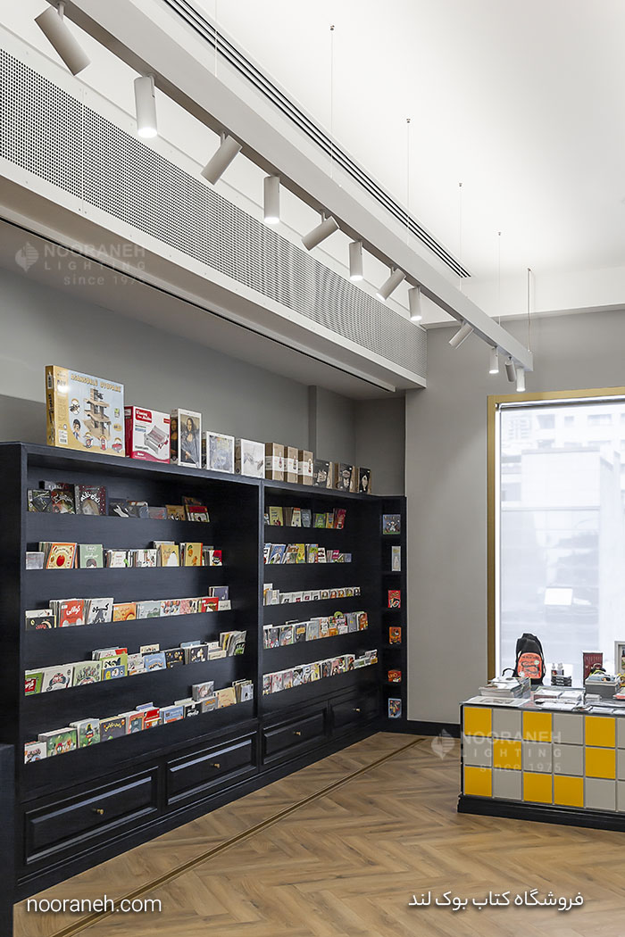 چراغ های این پروژه کاملا به صورت سفارشی و ترکیبی از چراغ های اسپات جهت نورپردازی تاکیدی فروشگاه و قفسه های کتاب و چراغ های لاین دو طرفه با نور غیر مستقیم توسط صنایع روشنایی نورانه تولید شده است.