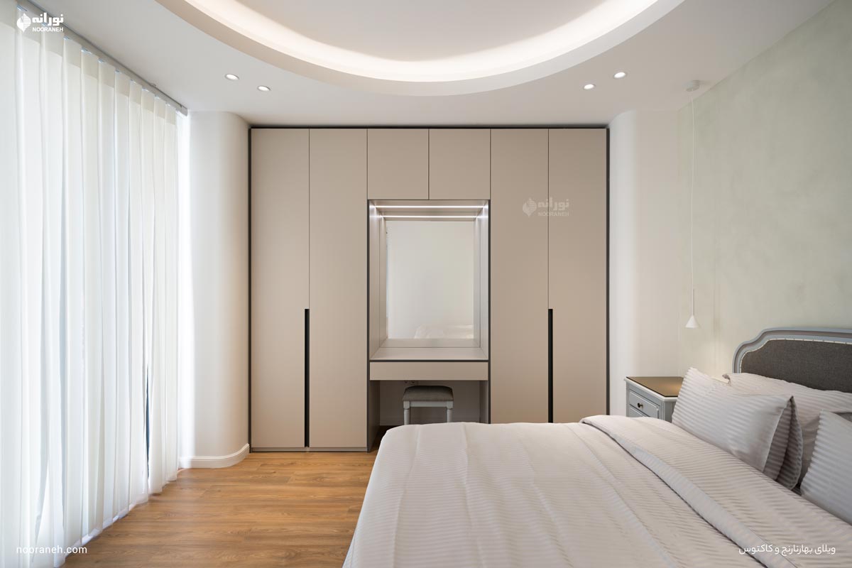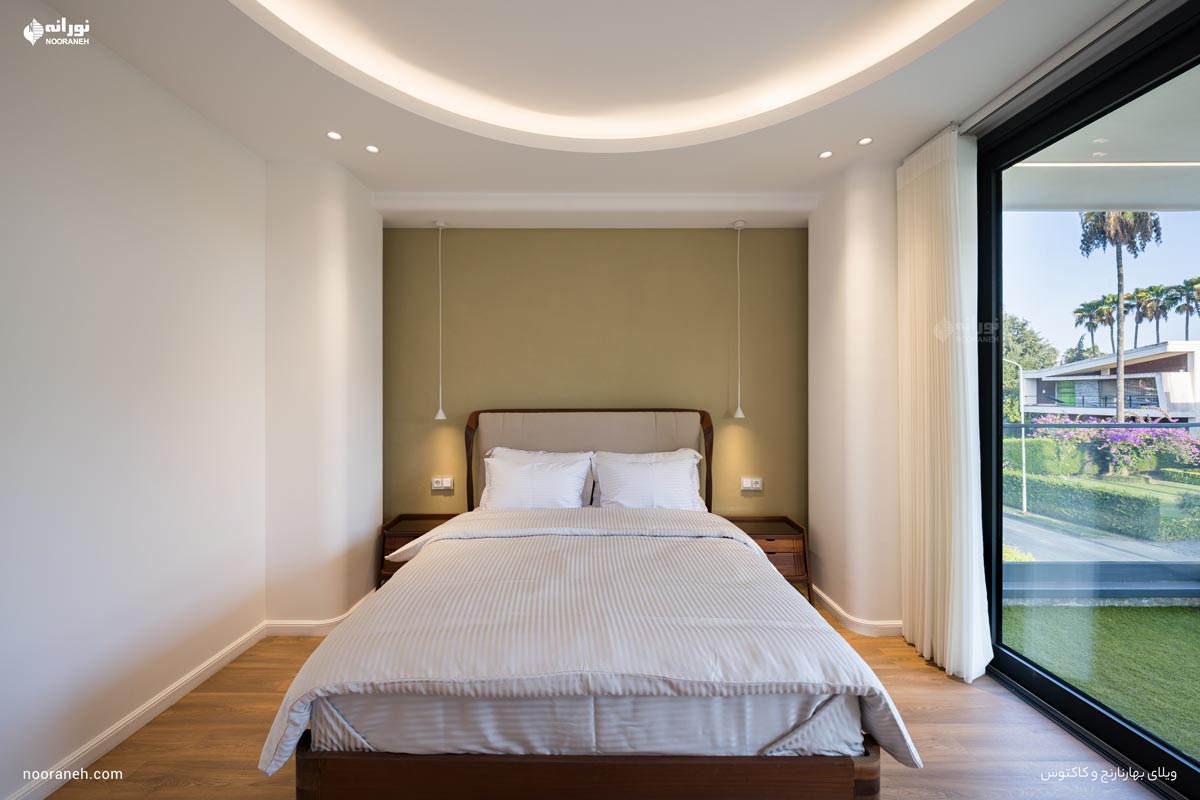 اتاقهای خواب با استفاده از چراغ کنج “کُرنرلاین” برای نور خطی غیرمستقیم، چراغهای آویز مدل “دوک” در دو طرف تخت جهت ایجاد فضایی گرم و آرامشبخش، و دانلایتهای “ملو” برای نور عمومی طراحی شدهاند.
