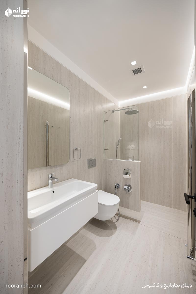 در حمام و سرویسهای بهداشتی، نور خطی غیرمستقیم با چراغهای “کُرنرلاین” در کنار دانلایتهای “تریمو” برای تأمین نور عمومی، فضایی مدرن و کاربردی ایجاد کرده است.