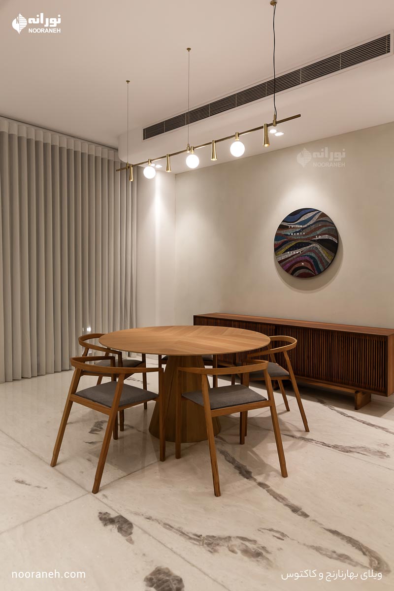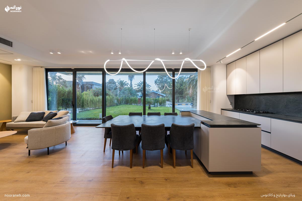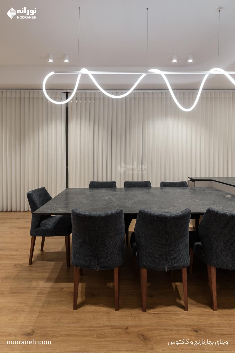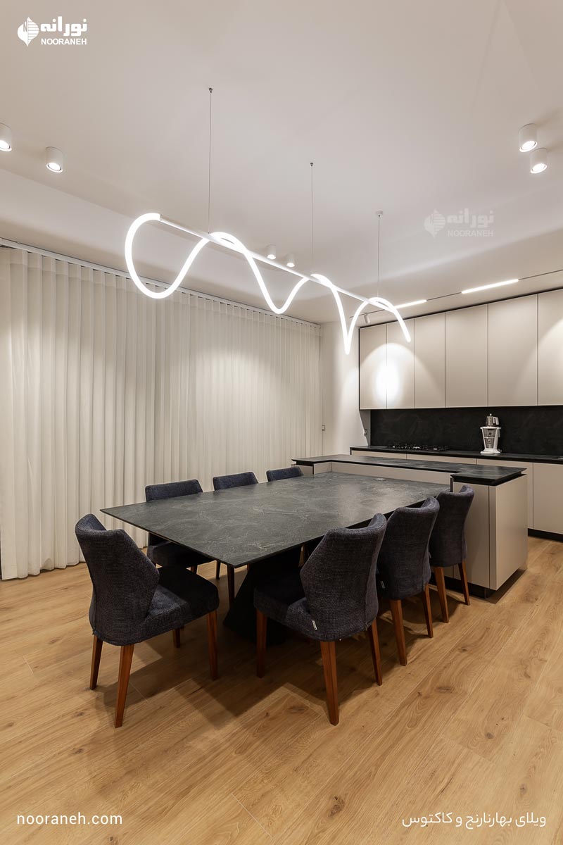 در آشپزخانه، چراغهای مگنتی مدل “ورونا” و “یونیک” وظیفه نور عمومی و تاکیدی را بر عهده دارند و چراغ فلکسی مدل “فلکس تیوب” برای نورپردازی دکوراتیو میز ناهار به کار رفته است.
