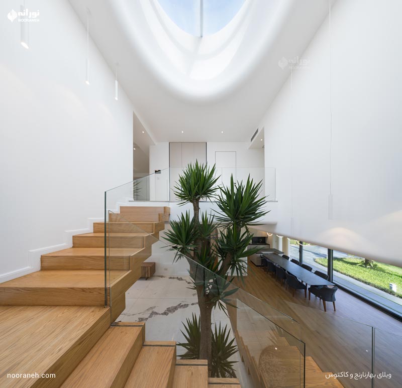 نورپردازی راهپله با چراغهای آویز “سیلوا” در امتداد مسیر، ضمن تأمین روشنایی مناسب، جلوهای زیبا به فضا بخشیده است.