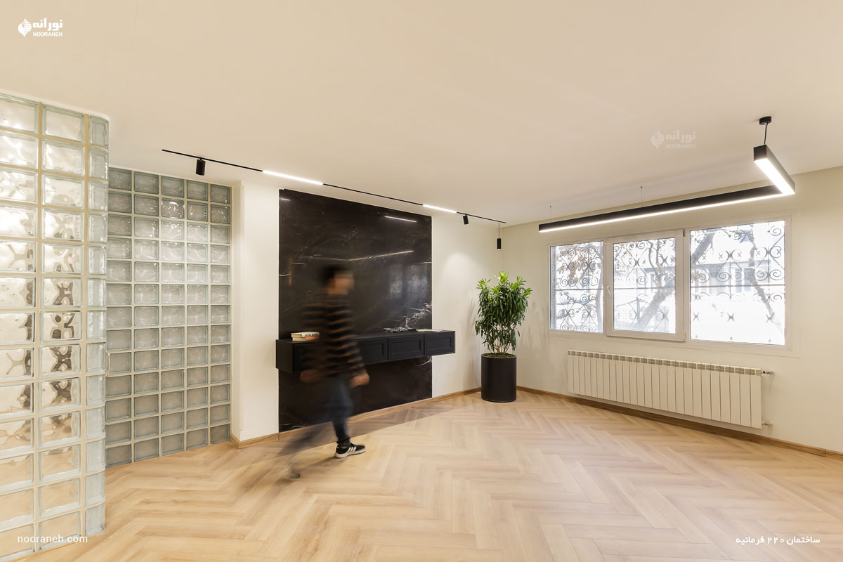 ساختمان ۲۲۰ فرمانیه یک پروژه ترکیبی با کاربریهای مسکونی و اداری است که با توجه به تنوع نیازهای نوری در این فضا، به طراحی نورپردازی با انعطافپذیری بالا نیاز داشت. برای پاسخگویی به این ضرورت، در نورپردازی فضای داخلی پروژه از چراغ های مگنتی مولتی ترک استفاده شده است. سیستم مولتی ترک به دلیل قابلیت نصب آسان، جابجایی سریع و تعویض بدون نیاز به تجهیزات خاص، امکان تنظیم و تغییر نور متناسب با نیازهای افراد را فراهم میکند. استفاده از این سیستم نهتنها پاسخگوی عملکردهای متنوع فضاست، بلکه به زیباییشناسی معماری داخلی نیز جلوهای مدرن میبخشد.