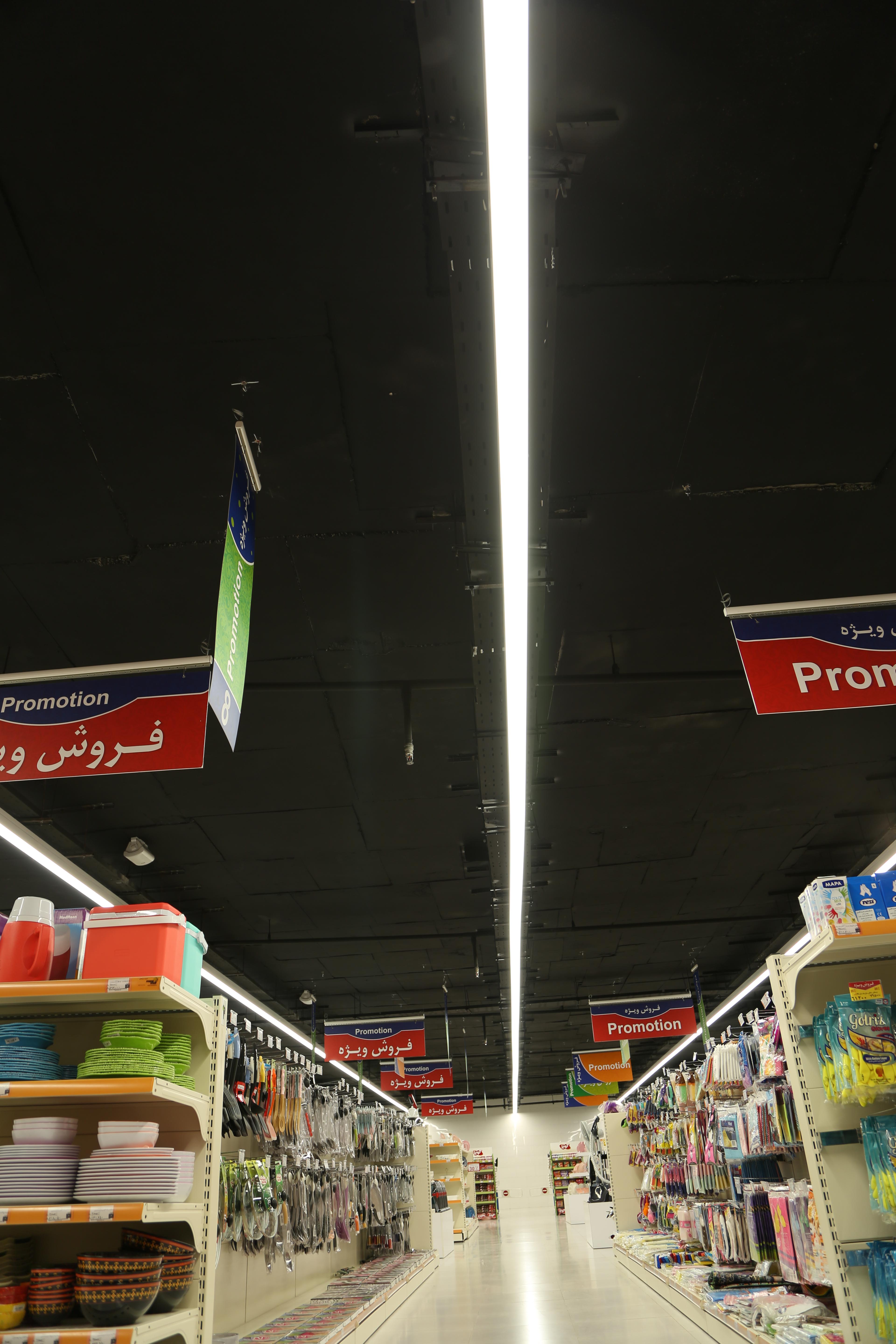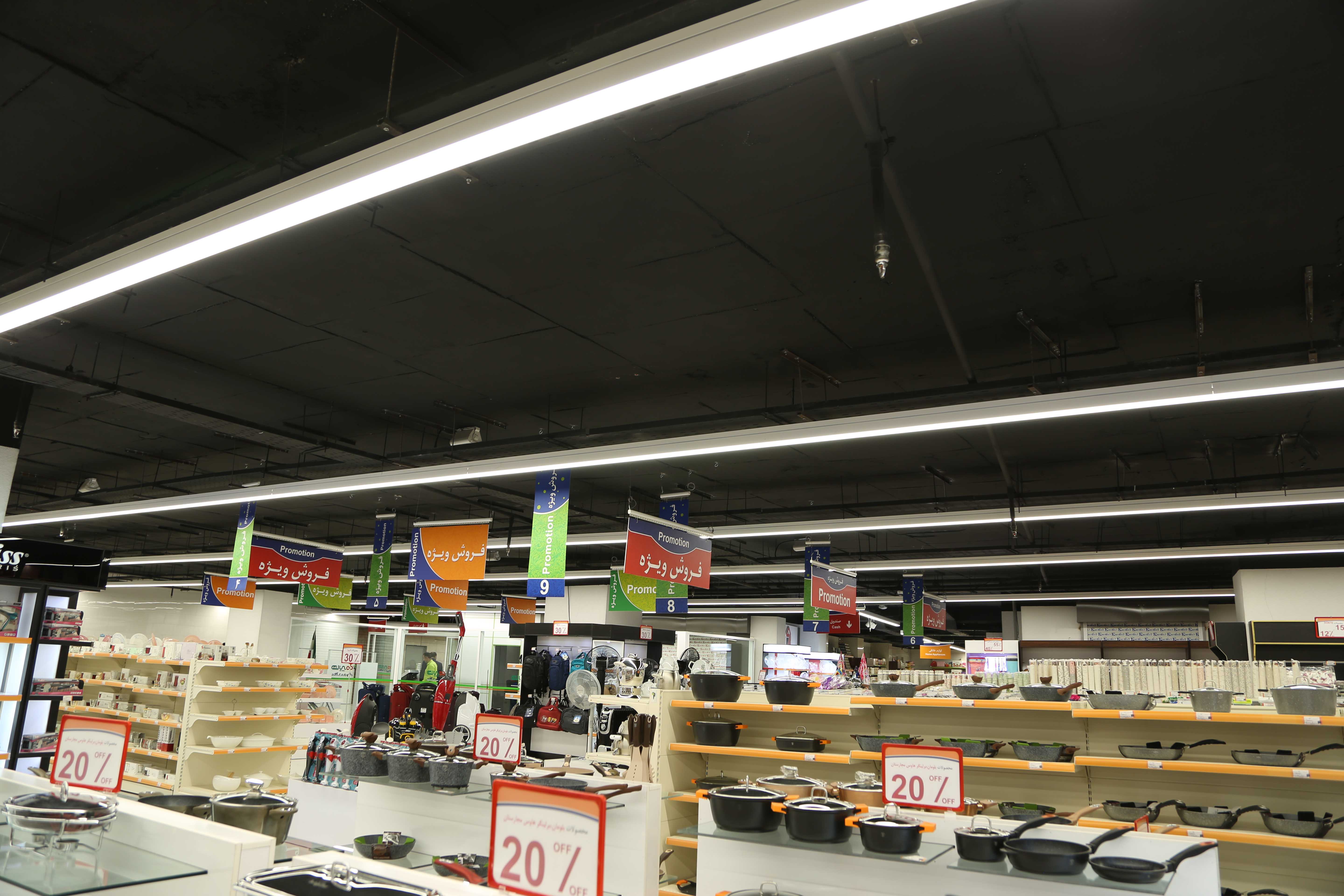 نورپردازی فروشگاه زنجیره ای هایپرمی توسط چراغ های خطی آویز با عرض 90 میلی متر، توسط صنایع روشنایی نورانه انجام شده و جلوه ای زیبا به فضای پروژه بخشیده است. از ویژگی های الکتریکی چراغ خطی آویز استفاده از ماژول SMD LED شرکت ترایدونیک اتریش با طول عمر بیش از 50000 ساعت می باشد.