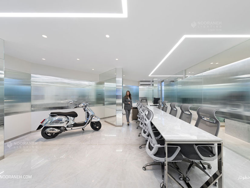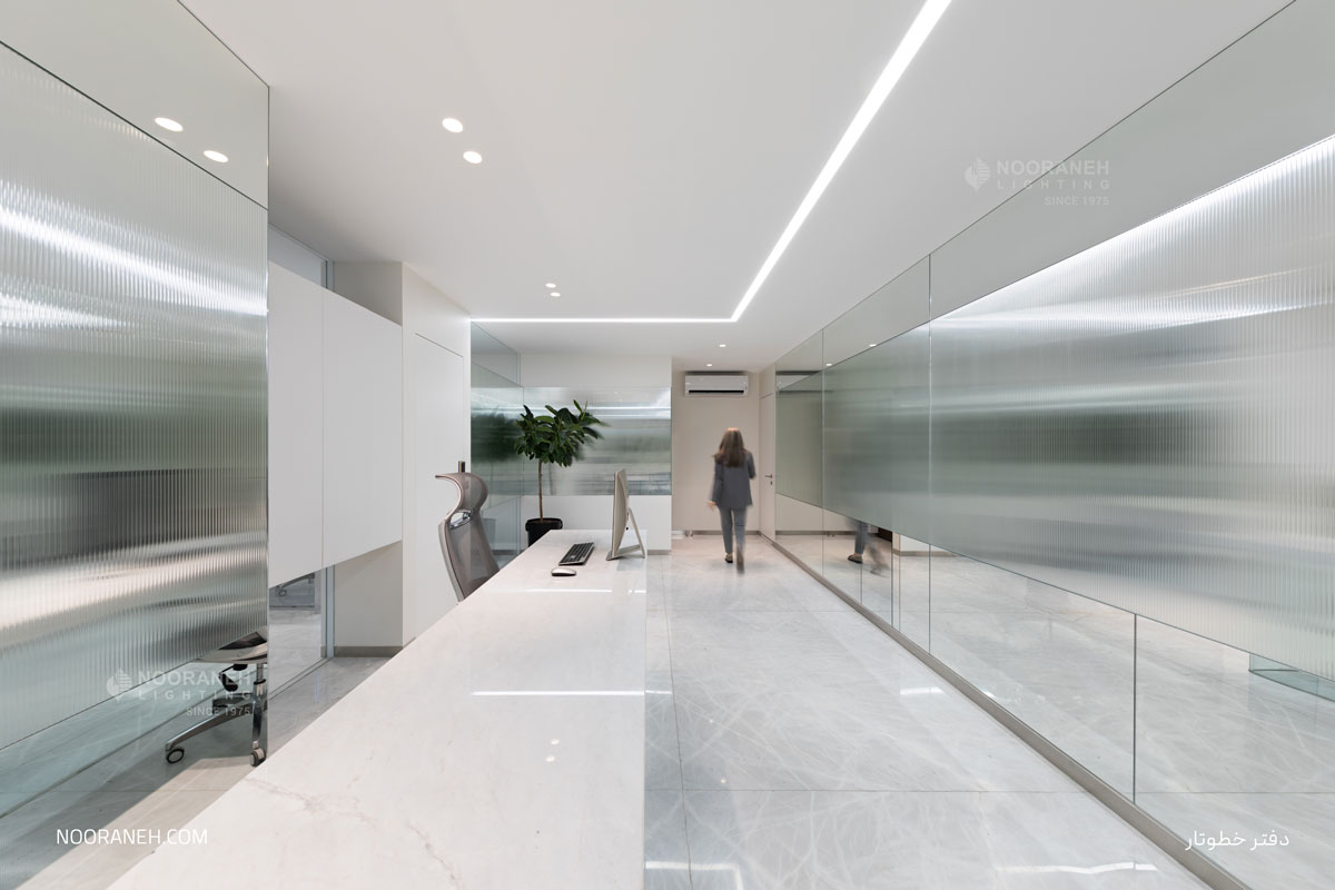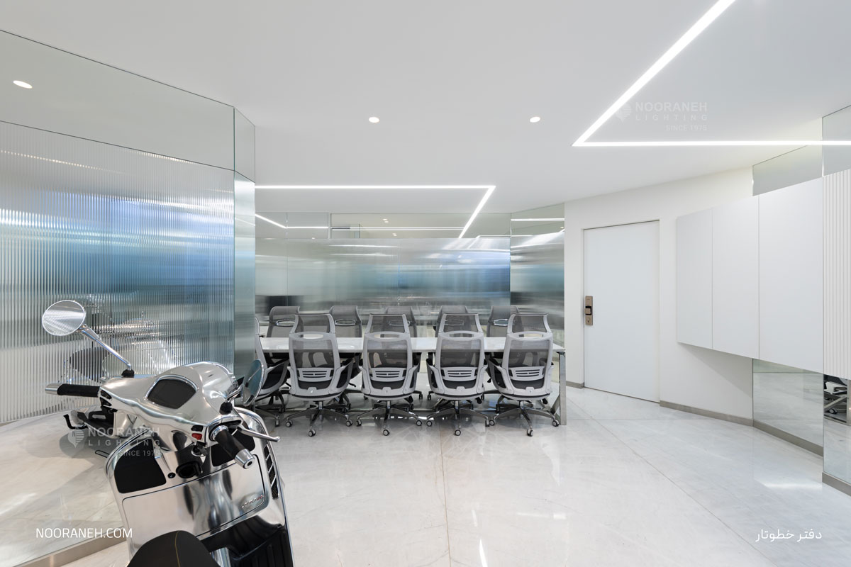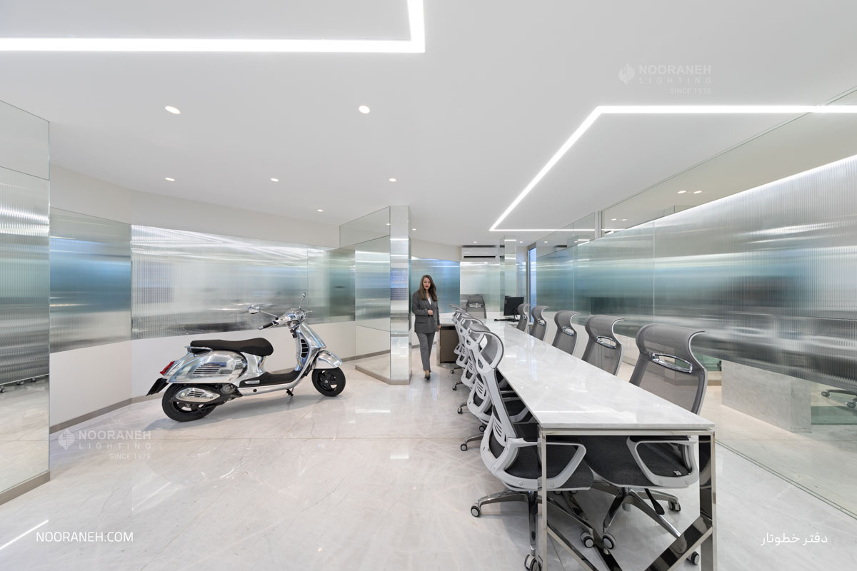 در دفتر اداری شرکت خطوتار از چراغ های خطی نورانه جهت تامین روشنایی عمومی فضا استفاده شده است. چراغ های خطی با بدنه آلومینیومی در رنگ های متنوع با پوشش آبکاری نقره ای و با ماژول های ال ای دی و درایور اروپایی تولید و عرضه می گردند. همچنین جهت نور تکمیلی فضا از چراغ های دارک لایت تریمو استفاده شده است.