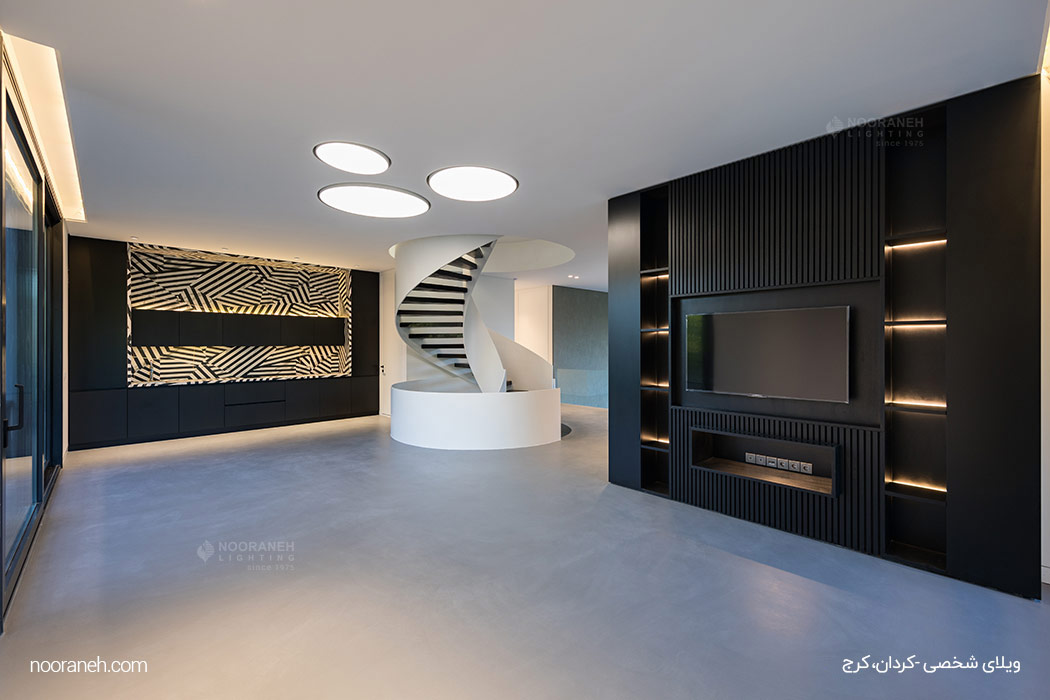 ویلای شخصی که در منطقه تفریحی کردان قرار گرفته است، پروژه ای با طراحی مدرن و با فرمی جذاب است که در طراحی آن سعی شده تا با محیط پیرامون خود بیشترین ارتباط را داشته باشد. فضاهای متنوع در این ویلا با چراغ های متنوعی نورپردازی شده است ولی رویکرد نورپردازی این پروژه استفاده از چراغ های دارک لایت مانند لنزا و تریمو بوده است تا از بیشترین آرامش بصری برخوردار باشد.