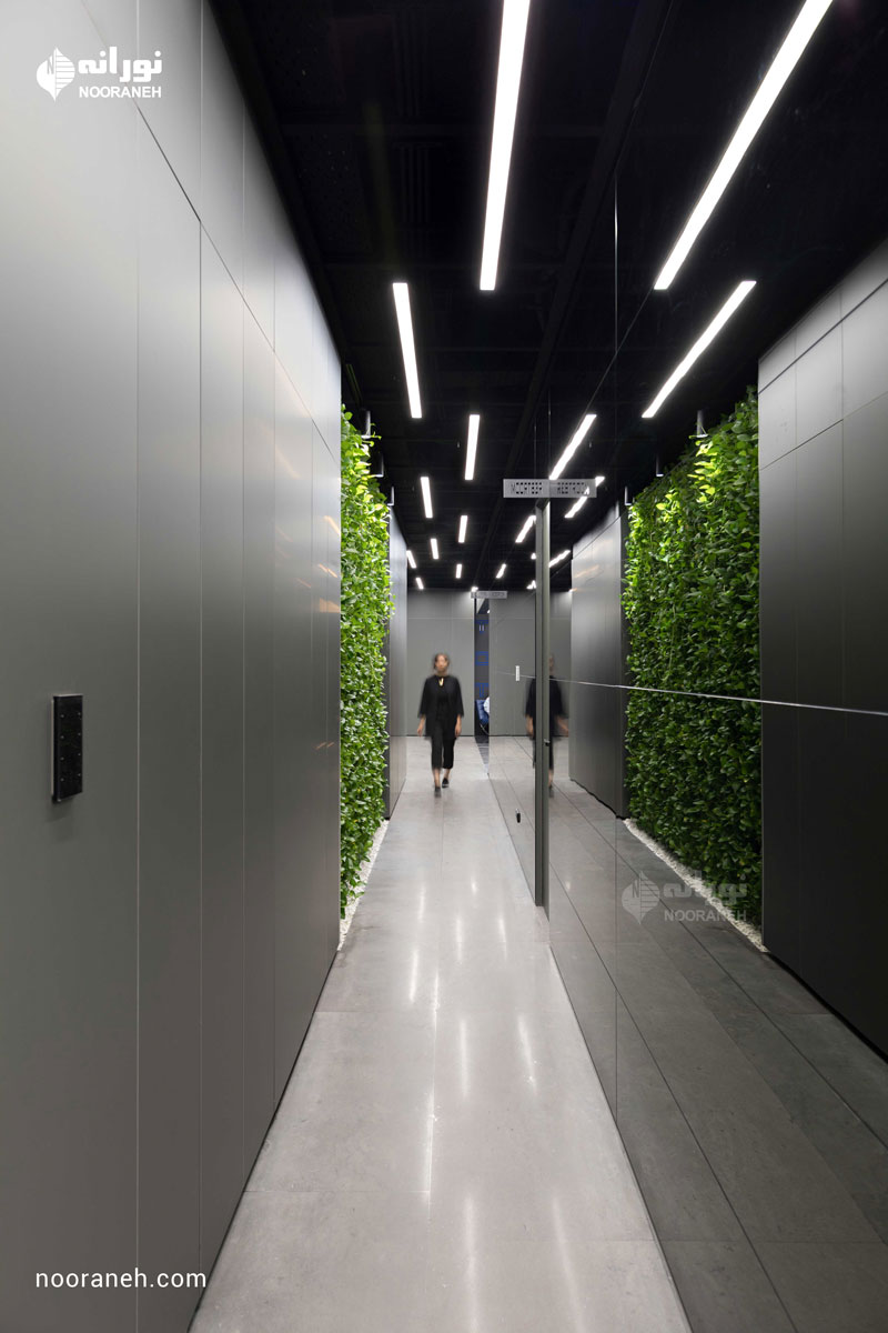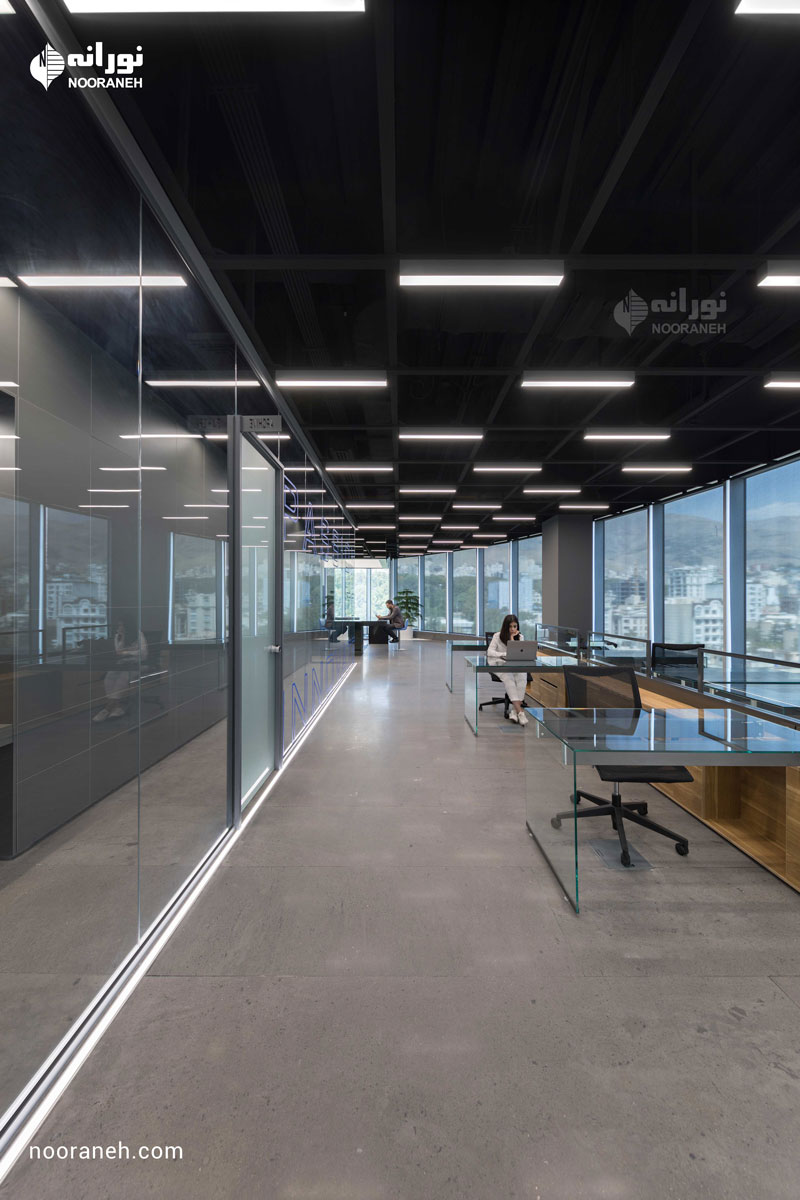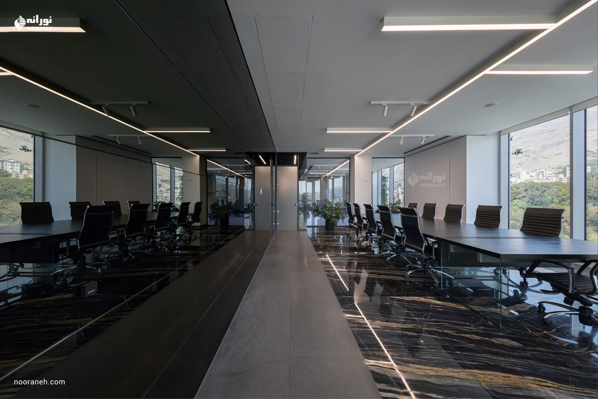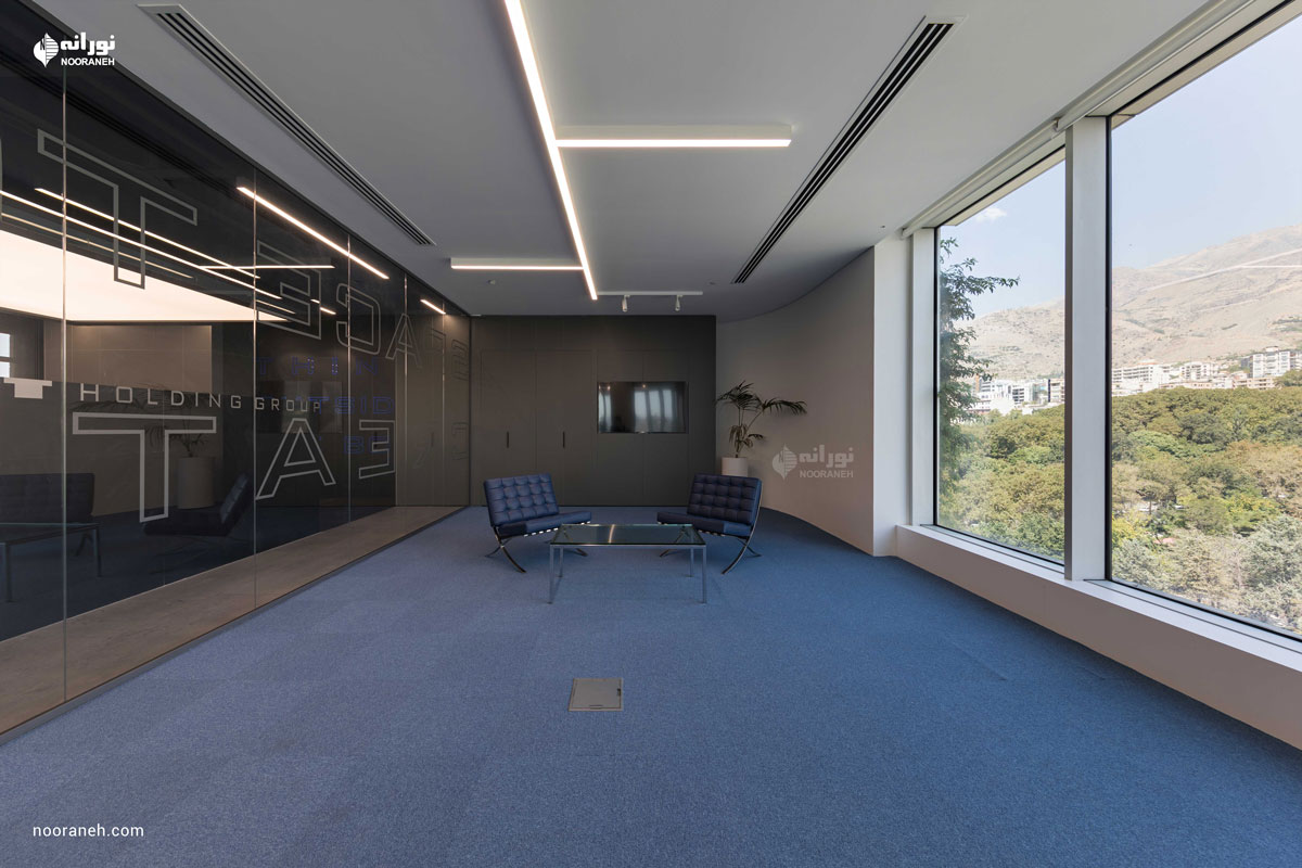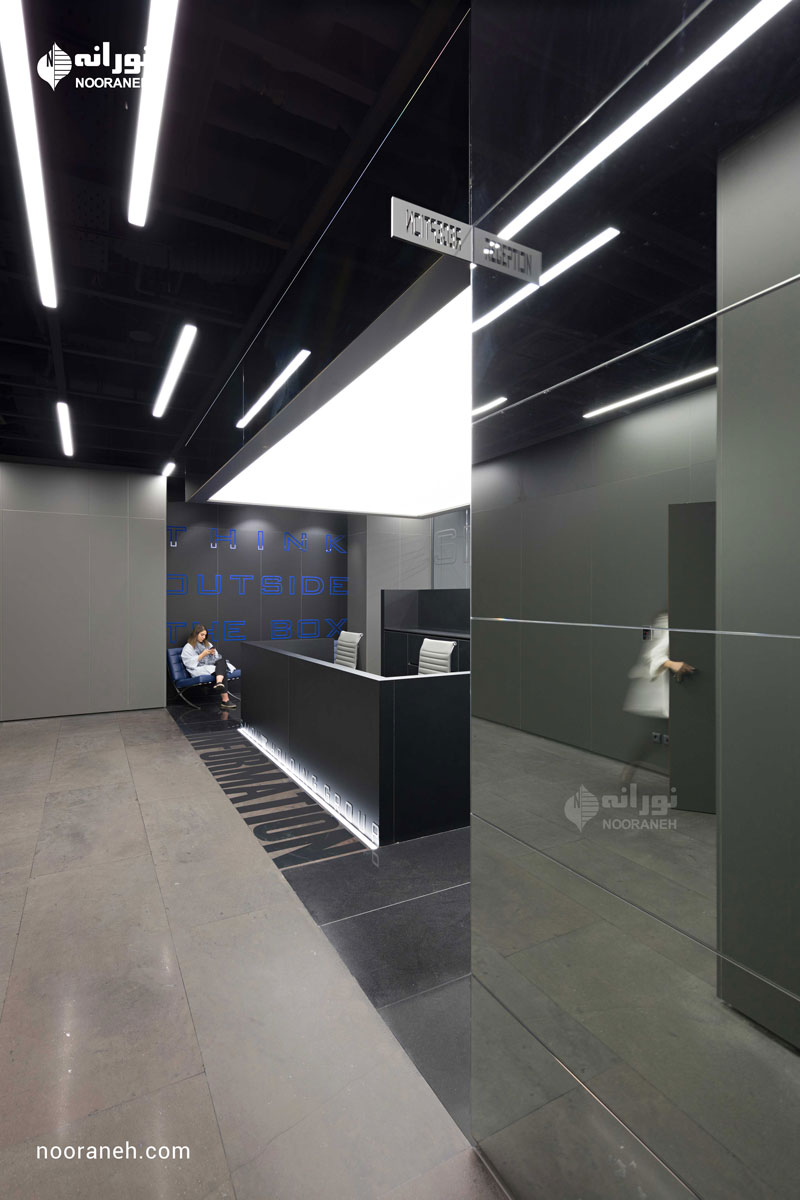 نورپردازی سقف دفتر بازتاب می بایست به گونه ای می بود که هم با فضاهای جعبه ای شکل و هم منحنی های خود بنا سازگار باشد ؛ لایه نورهای پاره خطی که تراکمشان متناسب با هر فضا تغییر می کند پاسخ مناسبی بود. ضمن آنکه با ریتم قرارگیریشان بر پویایی فضاها افزودند که این موضوع به ویژه در اطراف جعبه میانی و راهرو اصلی که بازتاب چراغ های خطی دیده می شود نمایان تر است.
