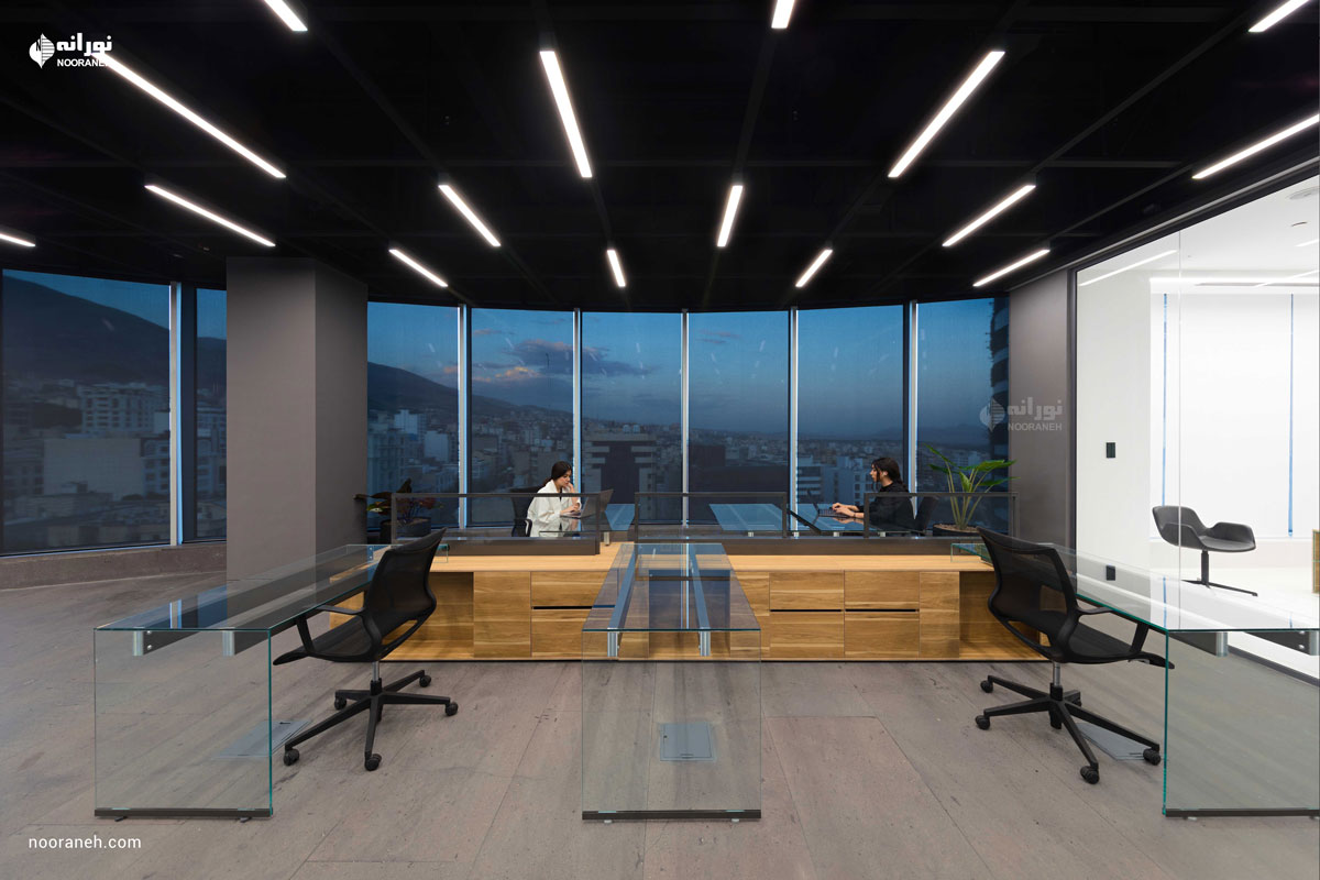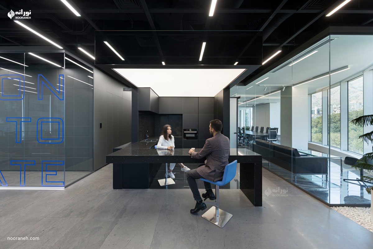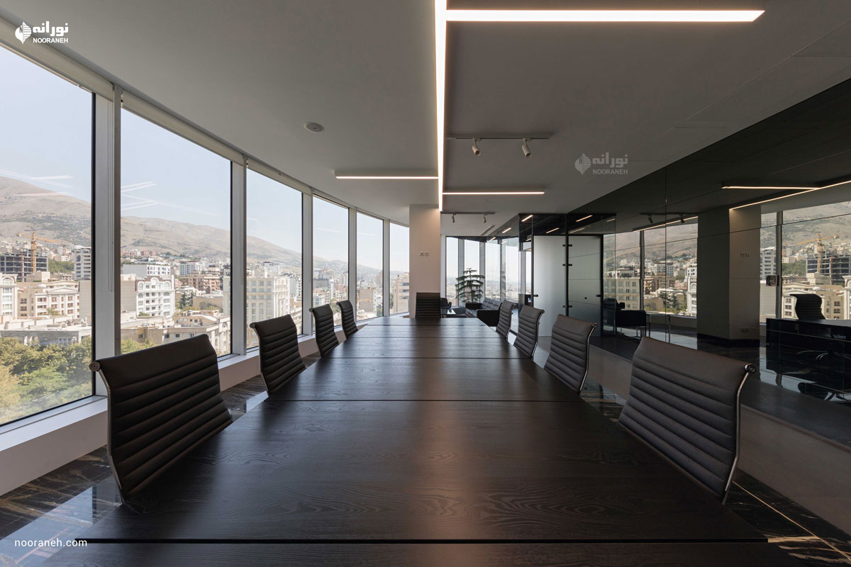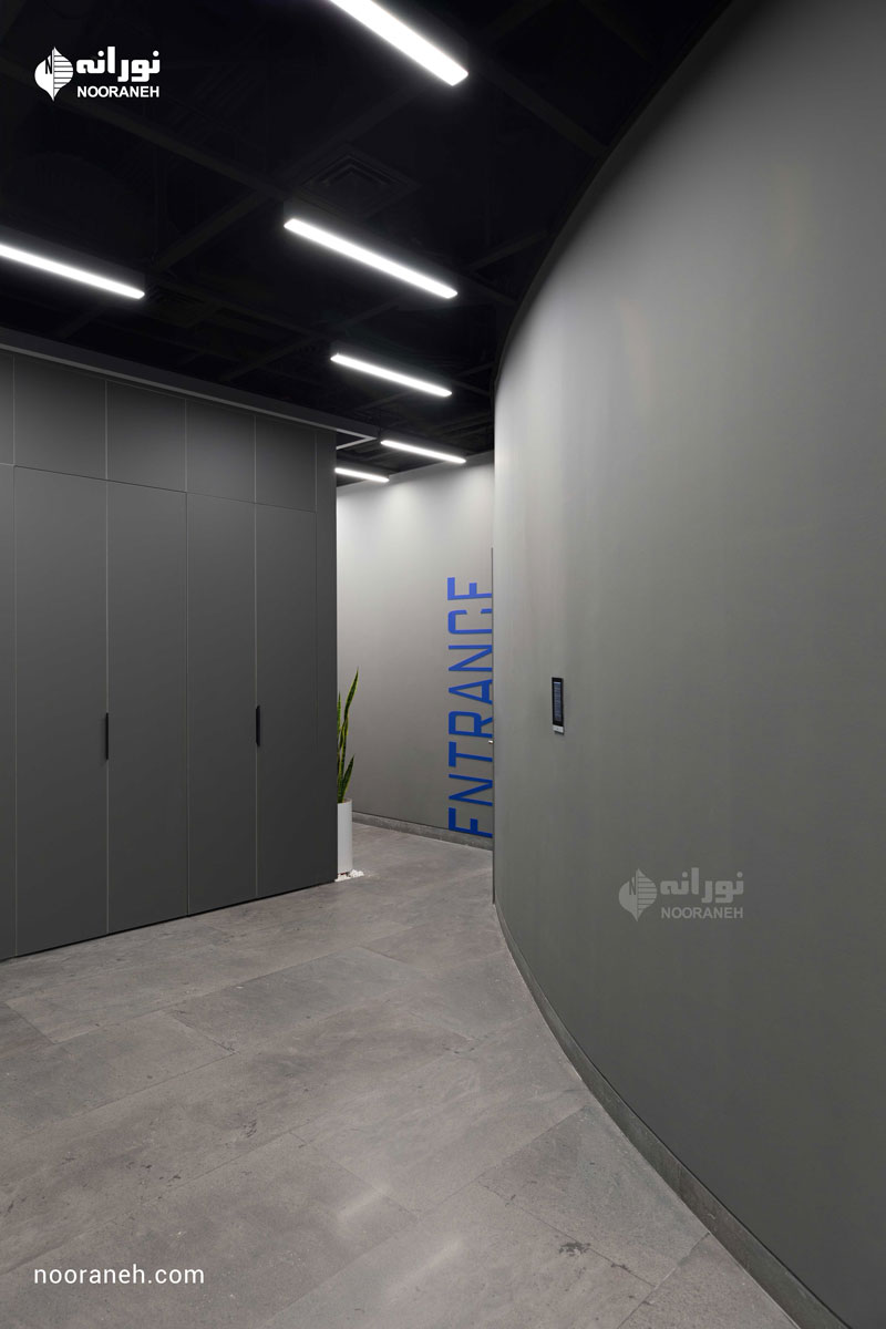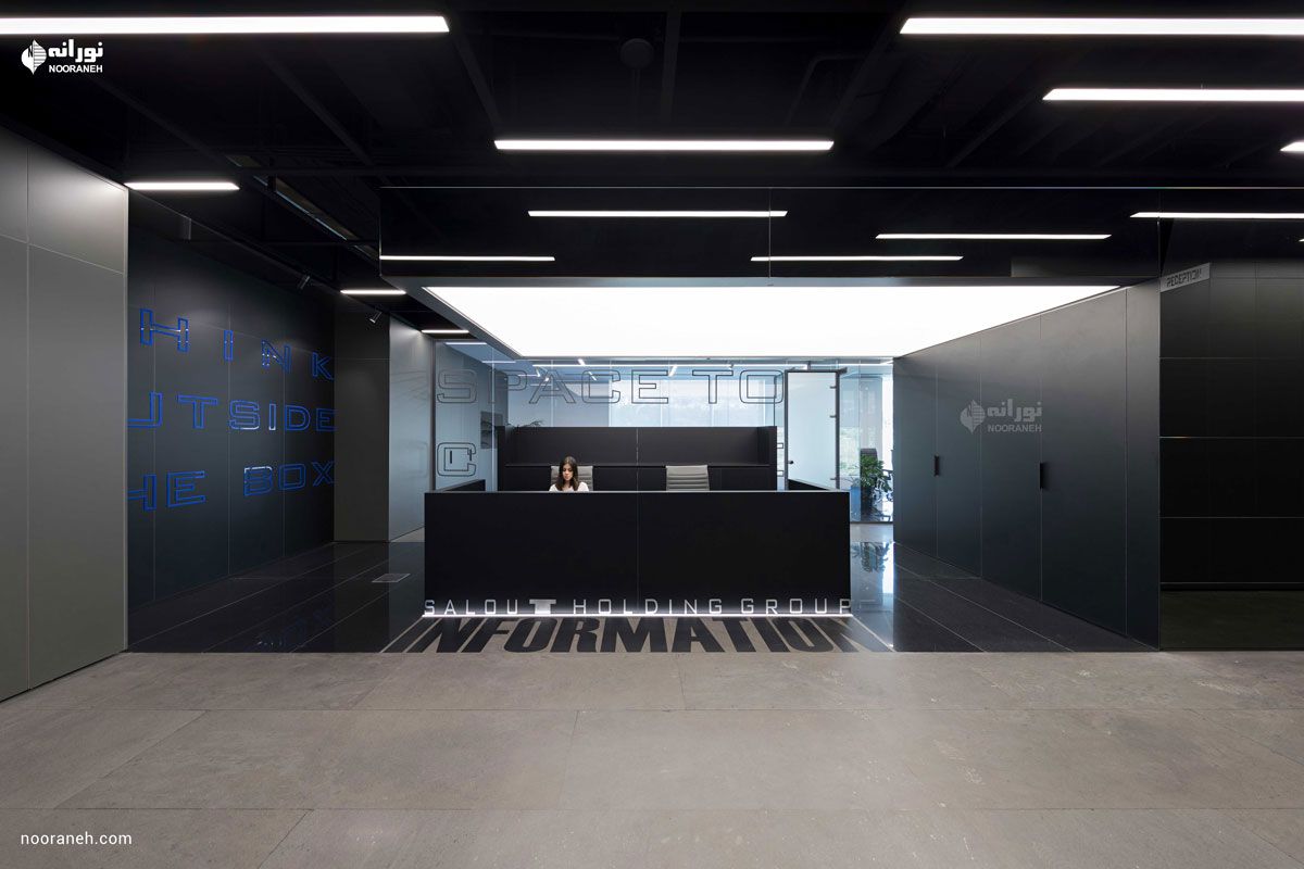نورپردازی سقف دفتر بازتاب می بایست به گونه ای می بود که هم با فضاهای جعبه ای شکل و هم منحنی های خود بنا سازگار باشد ؛ لایه نورهای پاره خطی که تراکمشان متناسب با هر فضا تغییر می کند پاسخ مناسبی بود. ضمن آنکه با ریتم قرارگیریشان بر پویایی فضاها افزودند که این موضوع به ویژه در اطراف جعبه میانی و راهرو اصلی که بازتاب چراغ های خطی دیده می شود نمایان تر است.