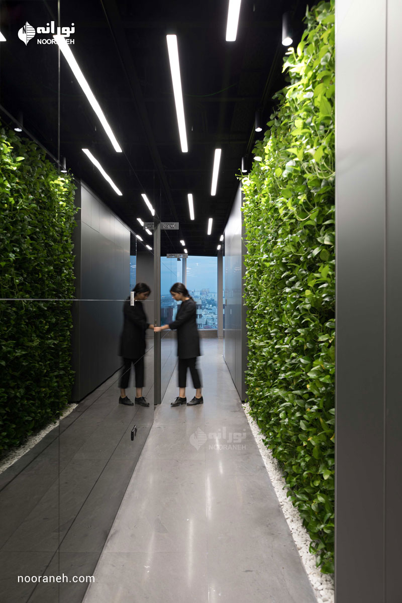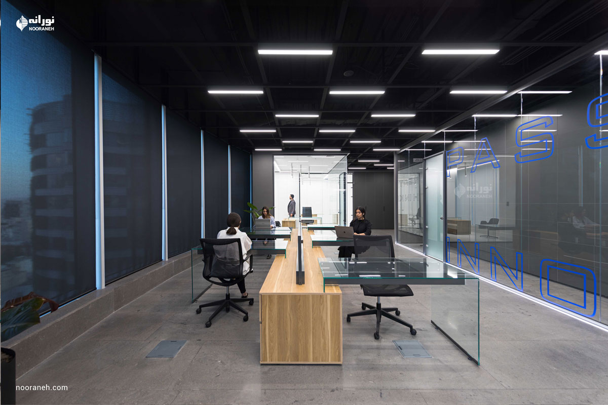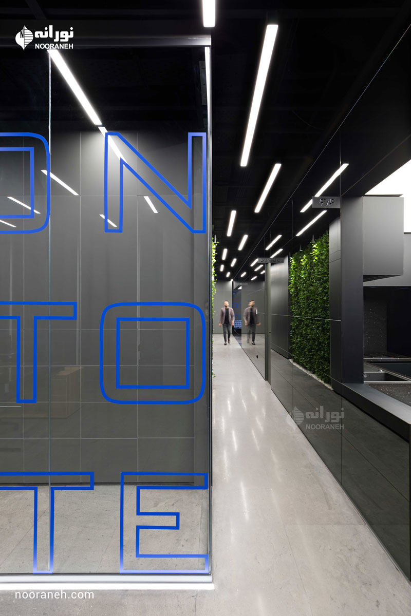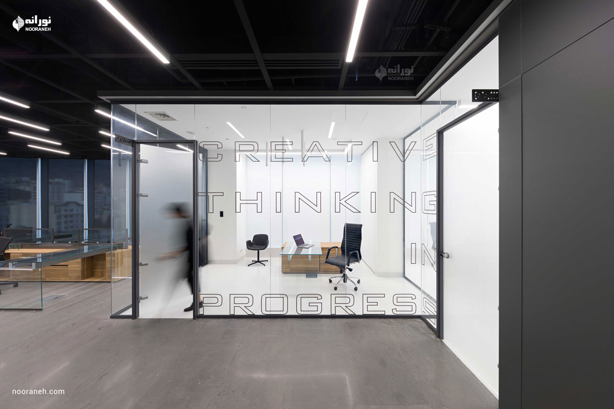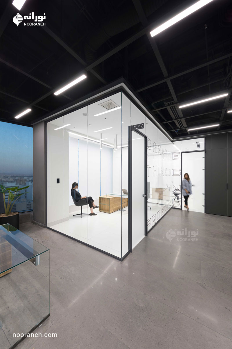 نورپردازی سقف دفتر بازتاب می بایست به گونه ای می بود که هم با فضاهای جعبه ای شکل و هم منحنی های خود بنا سازگار باشد ؛ لایه نورهای پاره خطی که تراکمشان متناسب با هر فضا تغییر می کند پاسخ مناسبی بود. ضمن آنکه با ریتم قرارگیریشان بر پویایی فضاها افزودند که این موضوع به ویژه در اطراف جعبه میانی و راهرو اصلی که بازتاب چراغ های خطی دیده می شود نمایان تر است.
