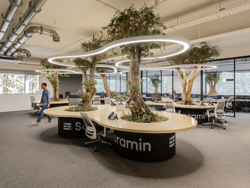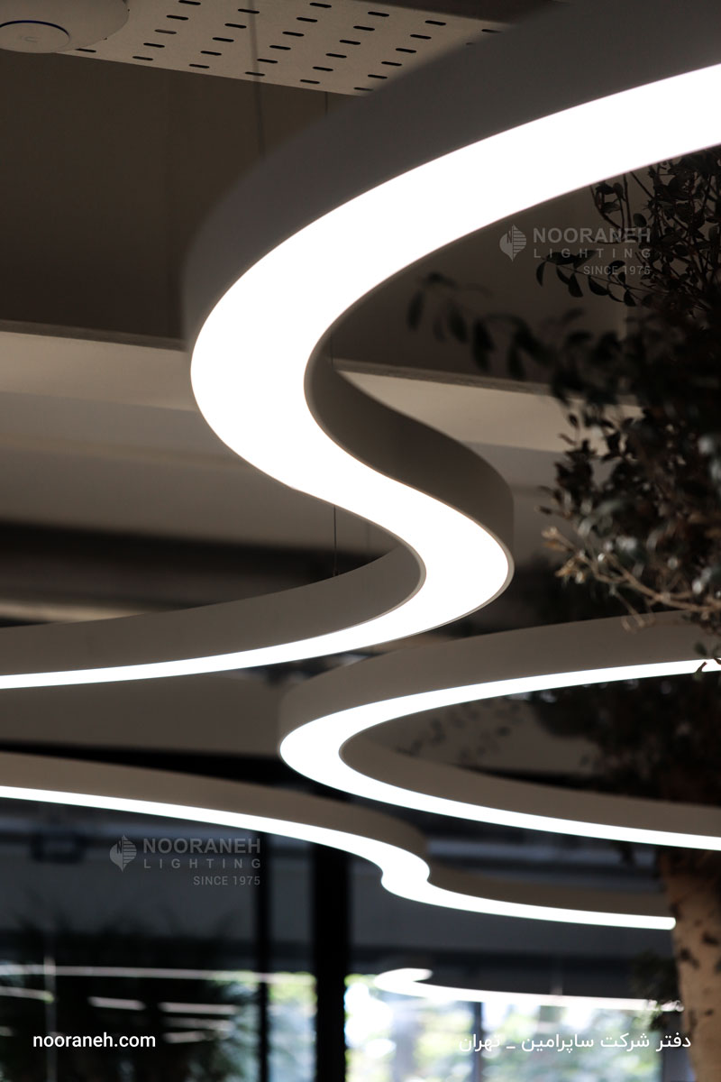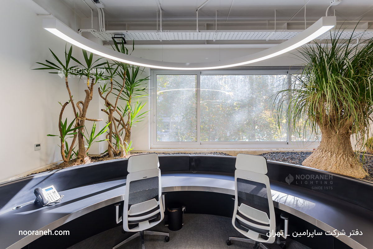 در طراحی مبلمان و نورپردازی دفتر شرکت ساپرامین، از خطوط نرم و فرم های ارگانیک منحنی دار استفاده شده است. شرکت نورانه با توجه به امکان تولید و سفارشی سازی محصولات روشنایی مطابق با ایده های معماری، چراغ های کرو آویز را برای این پروژه بر اساس طرح ها و کانسپت های معمار آن تولید کرده که زیبایی چشم نوازی به فضا بحشیده است.