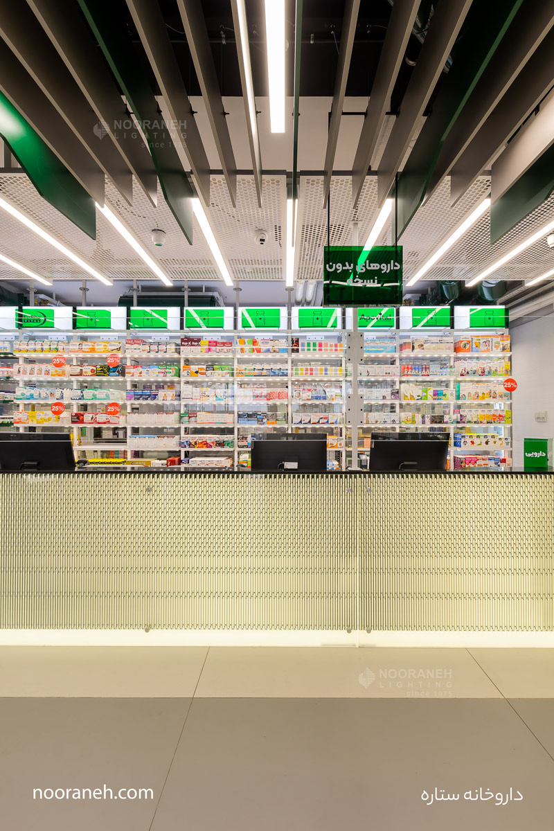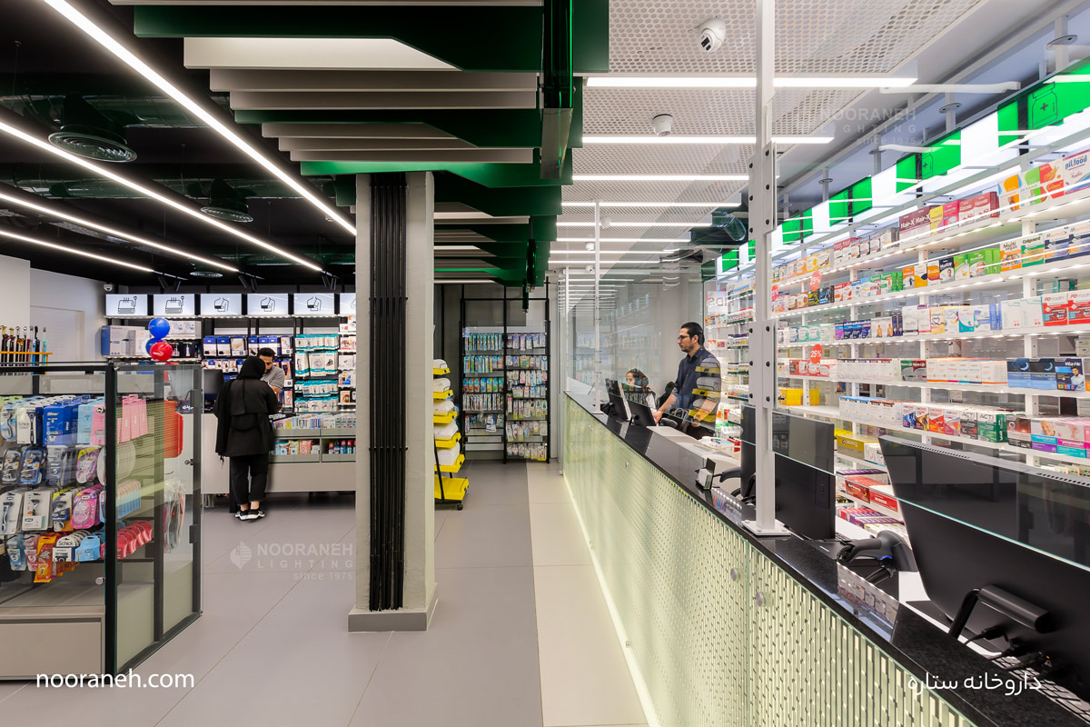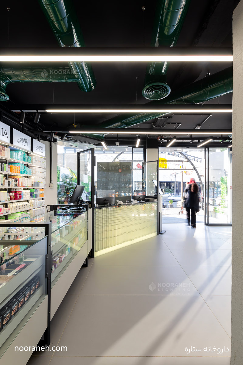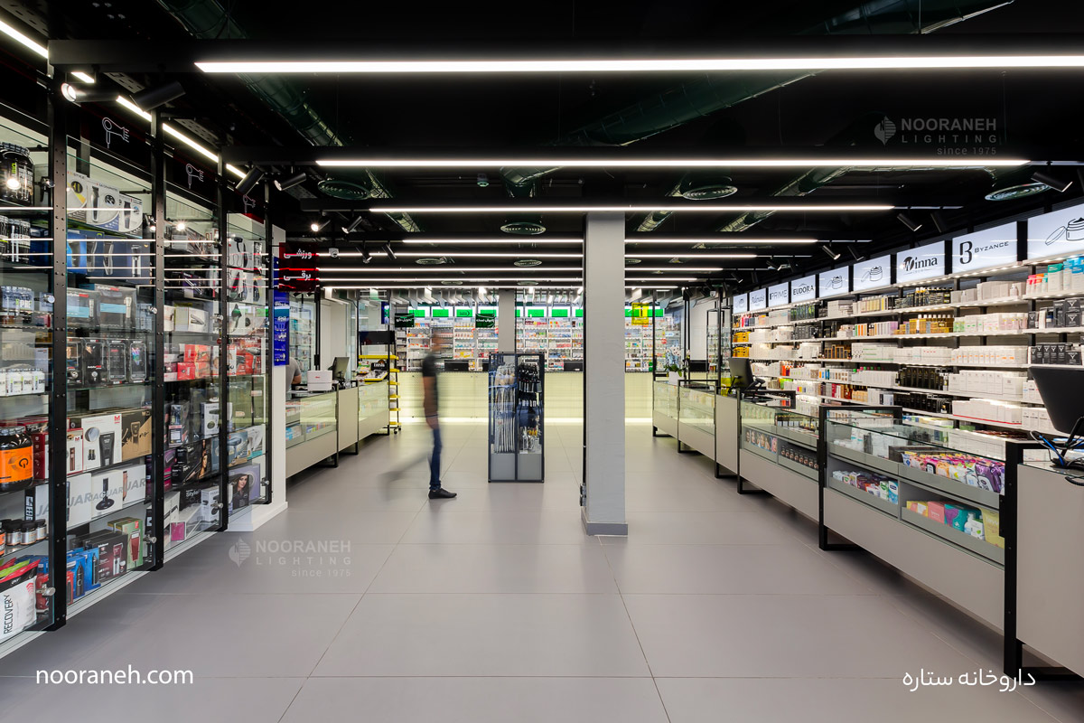با توجه به نوع کاربری این پروژه و نیاز به روشنایی عمومی در کنار نور تاکیدی، از سیستم روشنایی “اسپات لاین” نورانه در نورپردازی فضا استفاده شده است. این سیستم ترکیب چراغ خطی و چراغ اسپات است که هم زمان نور عمومی فضا و نور نقطه ای (برای روشنایی کافی و تاکید بر کالاها) را فراهم می کند.