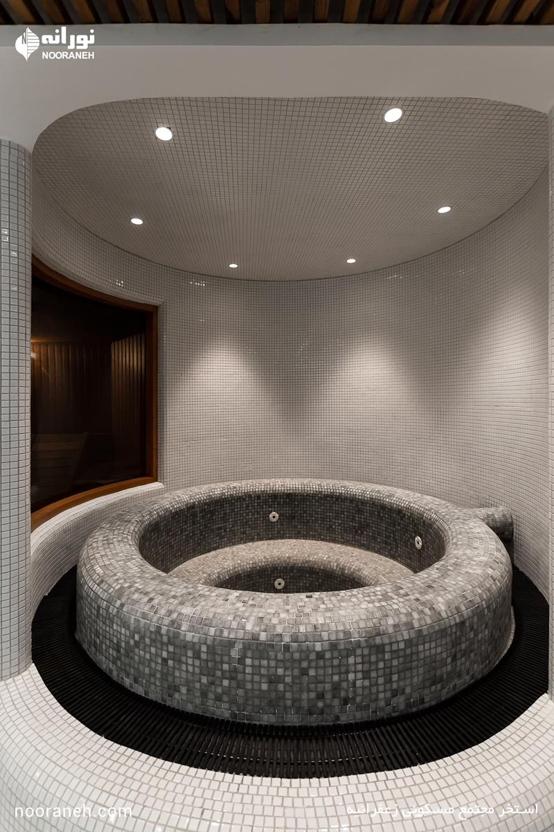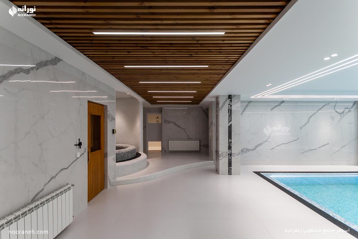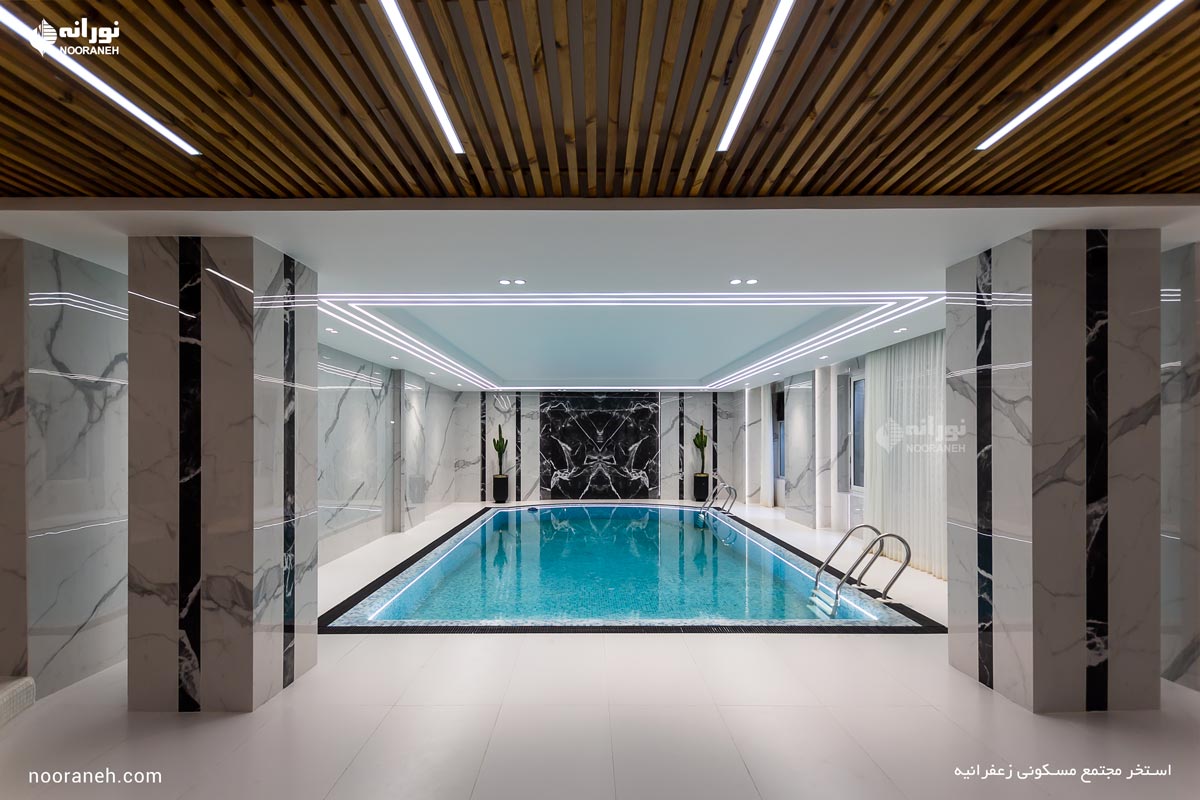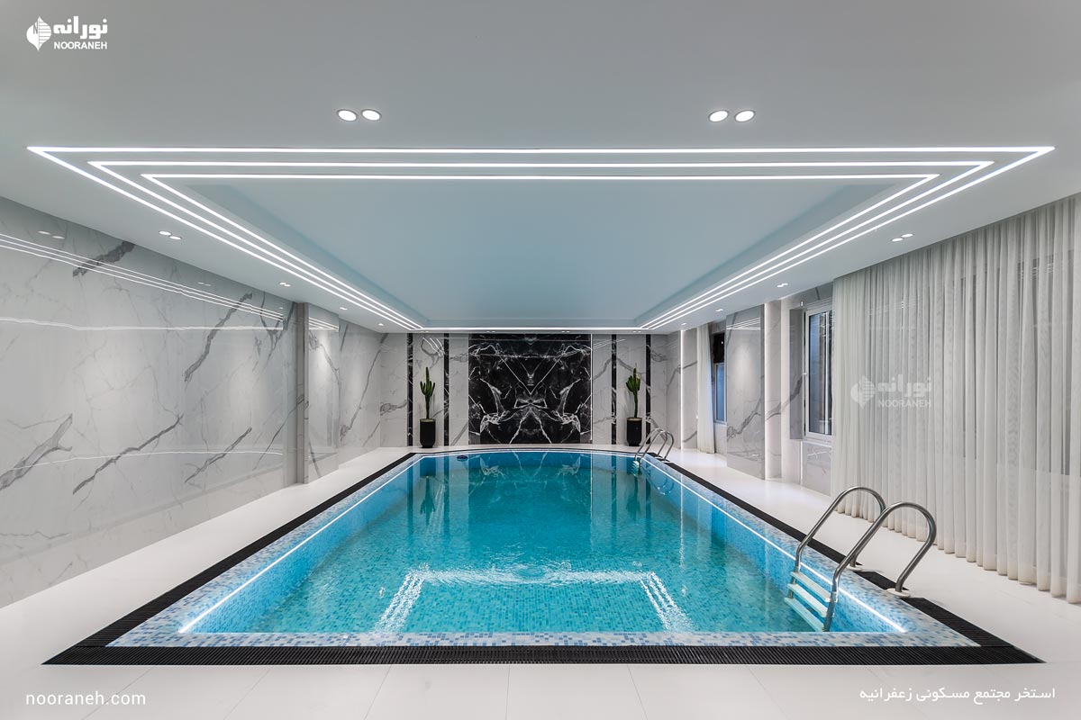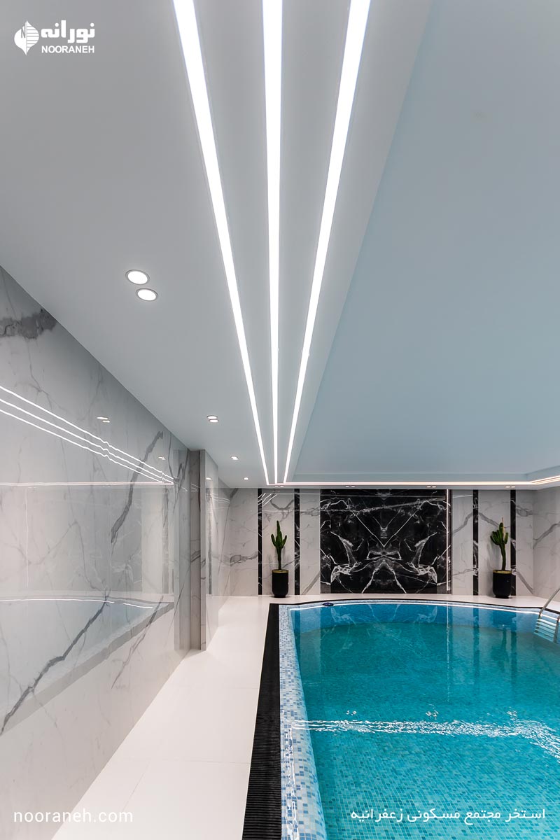 نورپردازی استخر مجتمع مسکونی زعفرانیه با هدف ایجاد فضایی مدرن، آرامشبخش و در عین حال لوکس اجرا شده است. در این پروژه، از چراغ ضد آب خطی مدل “ویو” در جدارههای استخر استفاده شده تا ضمن تأمین نور یکنواخت، جلوهای چشمنواز به آب و محیط استخر ببخشد. نورپردازی سقف نیز با استفاده از سه ردیف لاین نوری موازی و دانلایت های توکار مدل “تریمو” انجام شده که در ایجاد فضایی دلنشین و هماهنگ با معماری داخلی نقش موثری داشتهاند. ترکیب این عناصر نوری، استخر مجتمع را به محیطی منحصربهفرد برای آرامش و استراحت تبدیل کرده است.