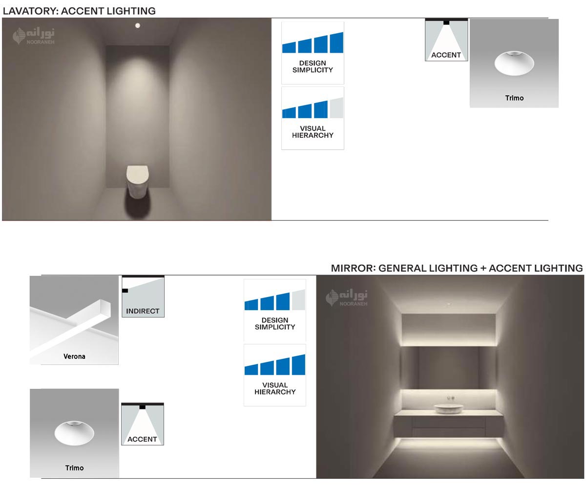 یک طراحی موفق در این فضا معمولا شامل چند لایه نور مکمل است: