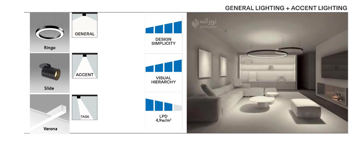 این لایه از نور معمولا از طریق نور خطی، منابع نور غیرمستقیم و چراغهای سقفی توکار تامین میشود تا محیطی آرام و بدون خیرگی ایجاد کند. - در کنار آن، نور تاکیدی وظیفهی ایجاد عمق، هویت و شخصیت فضا را بر عهده دارد.
