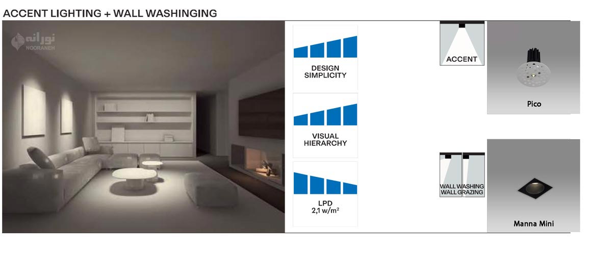 - نور تاکیدی برای برجسته کردن بافتها، مبلمان و جزئیات معماری استفاده میشود. این نوع روشنایی به اتاق شخصیت و عمق میبخشد و فضایی جذاب و دلپذیر ایجاد میکند.
