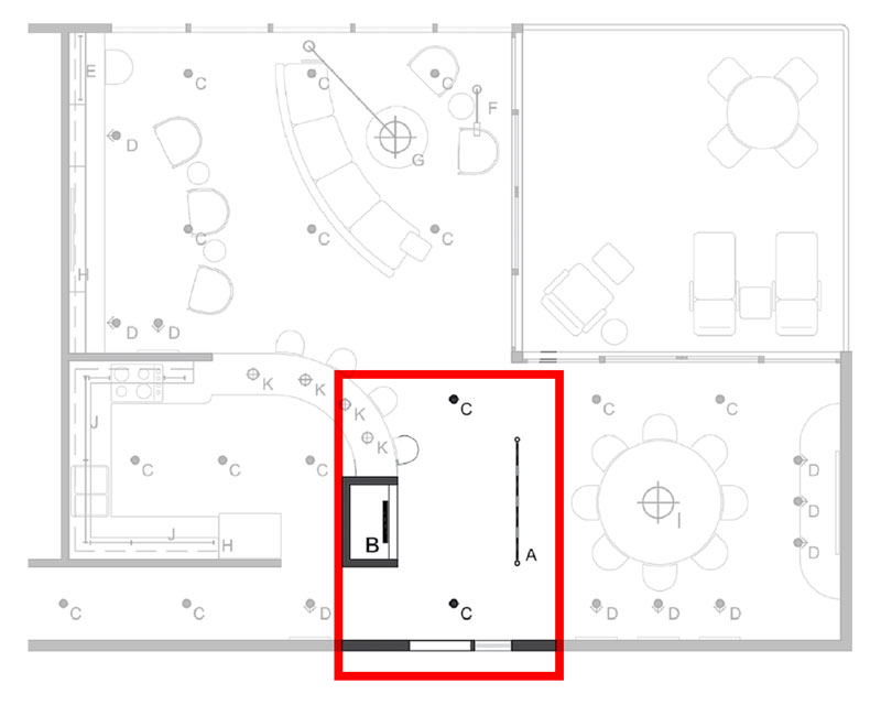 - نور محیطی توسط شش چراغ دانلایت توکار تامین شده که روشنایی یکنواختی را برای کل فضا به دنبال دارد و در پلان بالا با حرف C قابل مشاهده است. به علاوه، افزودن نور مخفی به بالای قفسههای کتاب (حرف H)، ضمن پیشگیری از ایجاد سایههای ناشی از قفسه با ایجاد درخششی مختصر، سقف را به طور کامل روشن کرده است. استفاده از دو منبع جداگانه برای روشنایی محیطی، انعطافپذیری فضا را برای کاربران افزایش میدهد. به این منظور از منابع روشنایی با پخش نور گسترده میتوان استفاده کرد.